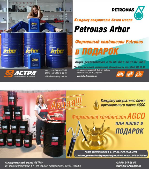 С 8 июня в компании Астра стартовали акции для покупателей оригинальных масел AGCO и Petronas Arbor.