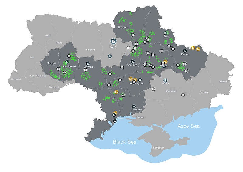Посівні площі (зелений колір), структурні підрозділи, елеватори та олійноекстракційні заводи «Кернел», пов'язані в єдину логістичну ланцюг, розташовані у всіх найважливіших аграрних регіонах України.