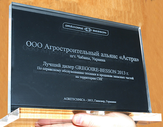 Во время выставки ИнтерАГРО 2013 в Киеве региональный директор подольского филиала компании «АСТРА» Сергей Власенко получил награду от Gregoire Besson за добросовестную и ответственную работу. А на состоявшейся в Германии выставке Agritechnica 2013 была награждена вся наша компания.