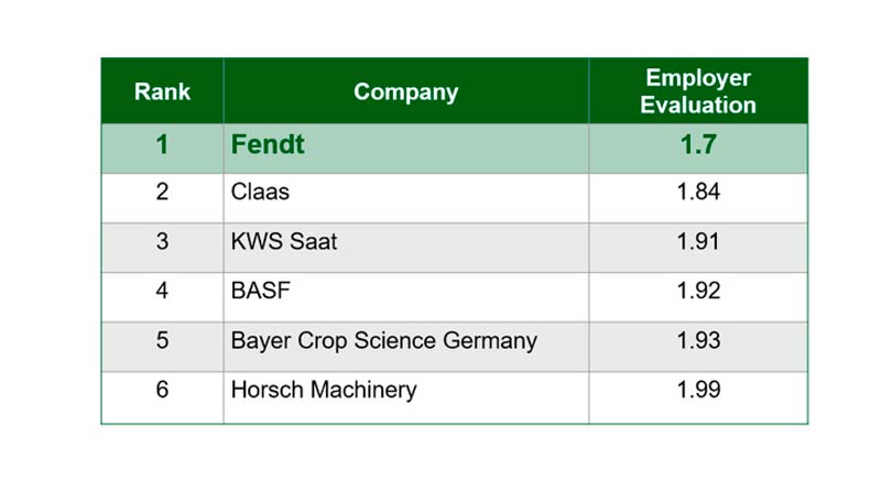 Отримавши середнє значення 1,7 за шкалою, співробітники та студенти поставили Fendt на перше місце у рейтингу DLG-ImageBarometer. Значення 1 відповідає оцінці в опитуванні «надзвичайно привабливо». Загалом сектор сільськогосподарської техніки є особливо популярним серед кадрів різних категорій.