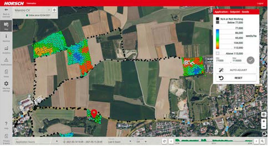 Але, звісно, є індивідуальні функції для кожної машини. Для обприскувачів можете побачити, наприклад, вибраний профіль форсунок, зокрема, відстань до цільової поверхні й діапазон тиску, з яким працювали. Актуальний статус форсунок також передається в систему, завдяки чому ви можете бачити, які з них активні, а також помилки, що раптом виникли в окремих форсунках/секціях. Для оператора Maestro, окрім основних даних, особливо важлива якість висіву. За допомогою порталу телеметрії він може з’ясувати коефіцієнт варіації машини або де саме на полі виникли просіви чи двійники.