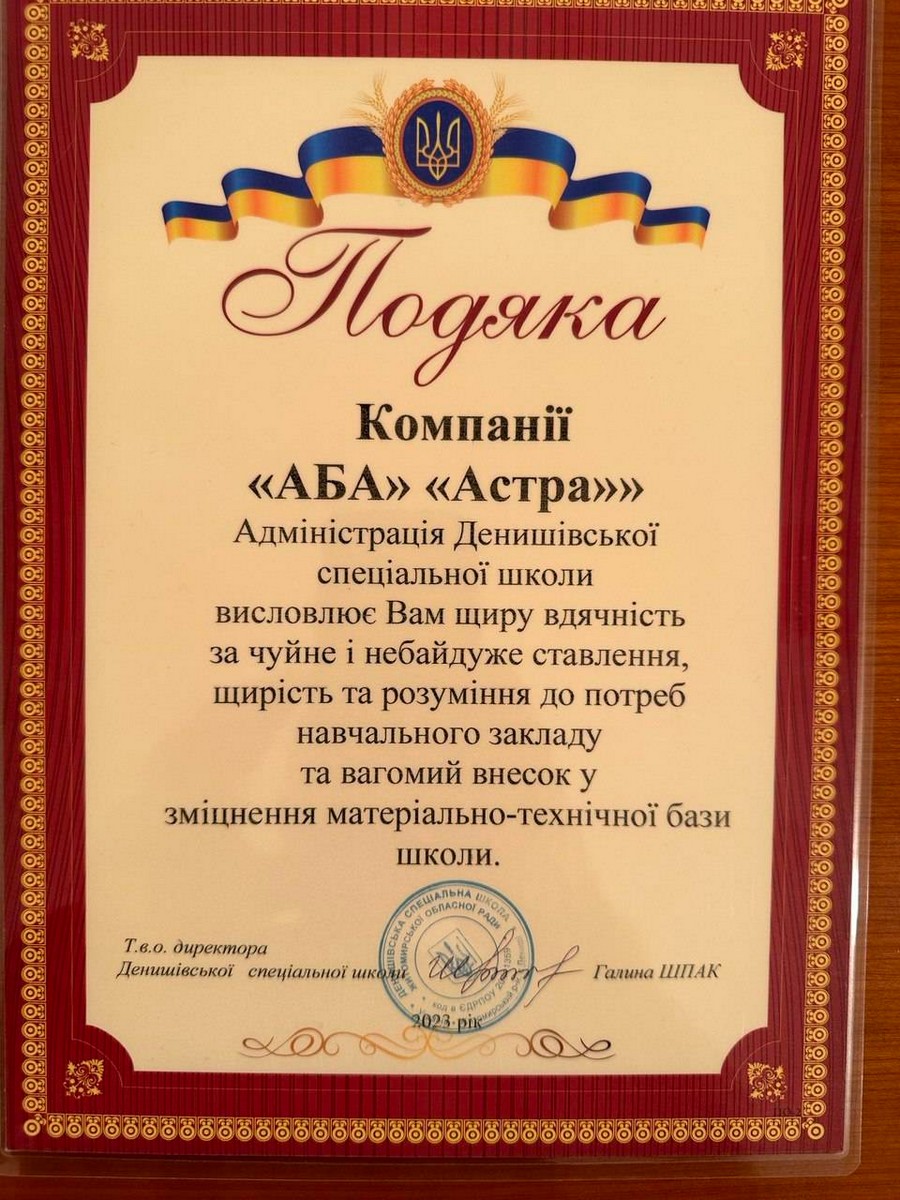 Минулого року ми розпочали благодійний проєкт з підтримки Денишівської спеціальної школи в Житомирській області. За цей час ми регулярно відвідували вихованців не тільки, щоб передати необхідні харчові продукти, фрукти, овочі, шоколад, а й приділити дітям свою увагу та турботу. Так, цього тижня до школи приїхали генеральний директор «АБА «Астра» Ігор Губарєв та інвестор Ласло Пеєцз.
