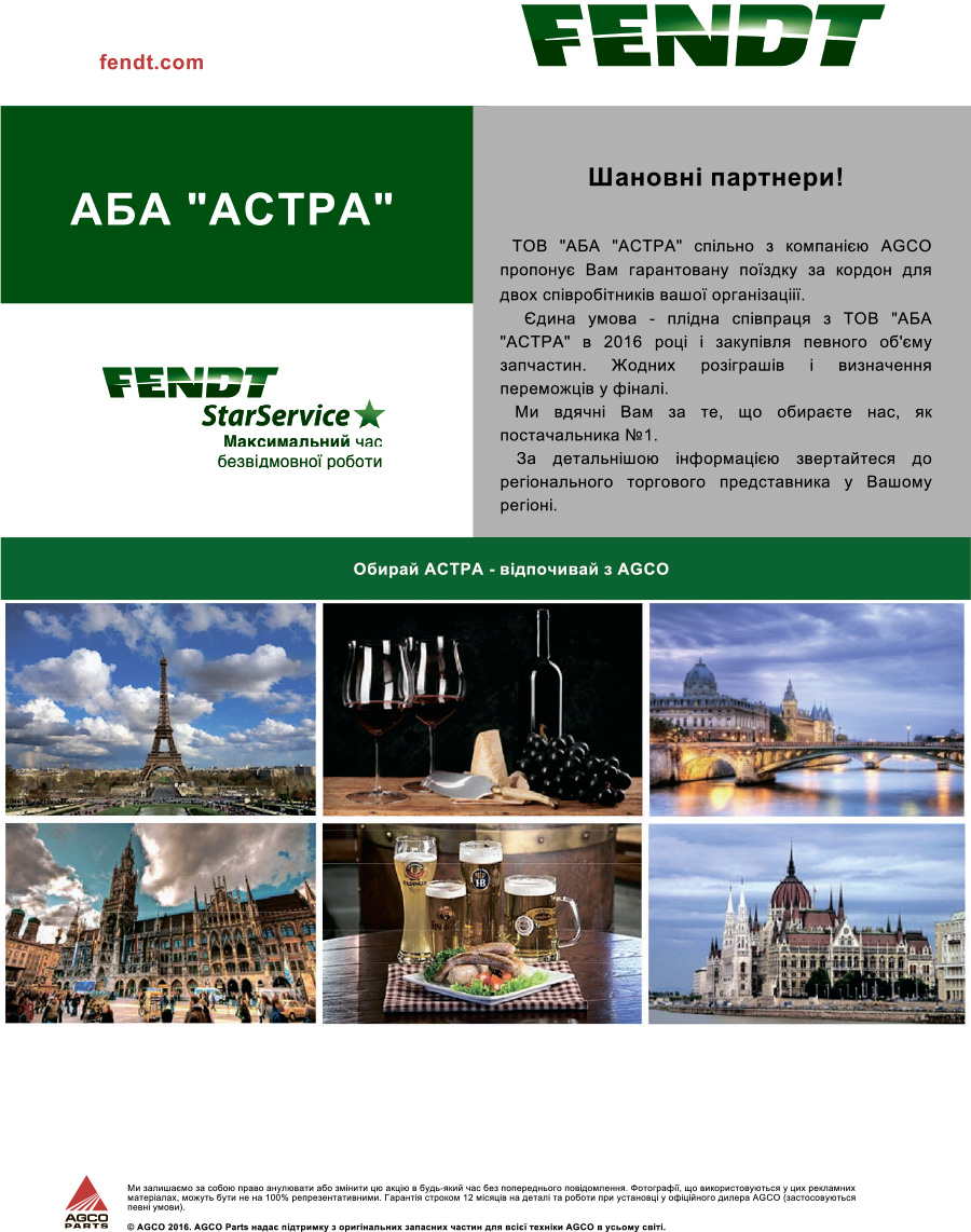 ТОВ «АБА «АСТРА» спільно з компанією «АГКО» пропонує своїм клієнтам провести незабутній вік-енд в Європі.