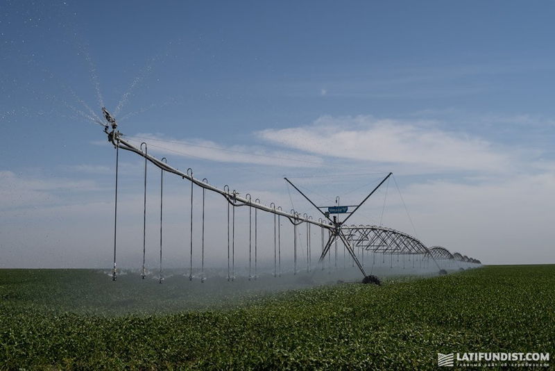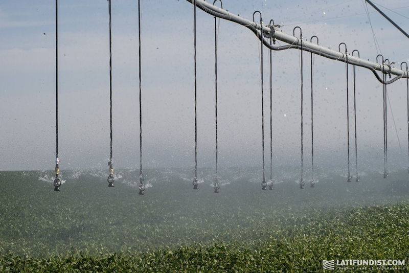 Чтобы увидеть весь процесс орошения и подробнее узнать о самом оборудовании, отправляемся на одно из полей предприятия. Здесь на 115 га выращивают сою. Длина системы кругового орошения 608 м. Работает уже третий год.