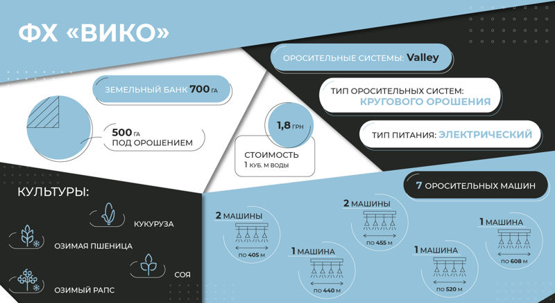 К тому же, со слов Виктора Возняка, понимая, что система орошения — удовольствие не из дешевых, оформили оборудование в рассрочку на 8 месяцев. Около 20-30% от стоимости «Вико» проплачивало сразу, остальную сумму — после уборки урожая.