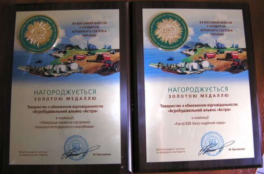 Среди них была и компания «АСА «АСТРА», получившая медали и памятные дипломы в двух номинациях: «Fendt 936 Vario – надійний лідер» и «Найкраща сервісна підтримка сільськогосподарського виробника».