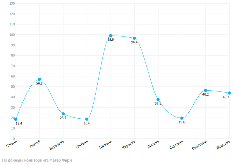 Перш ніж вирушати в дорогу, звертаємося до фахівців сервісу агропогоди «Метео Фарм» з проханням розповісти про погодні нюанси в регіоні. Так, найбільш вологими були травень і червень, коли випало 98,9 мм і 96,4 мм опадів відповідно. Найменшу кількість опадів зафіксовано в січні, квітні та серпні.