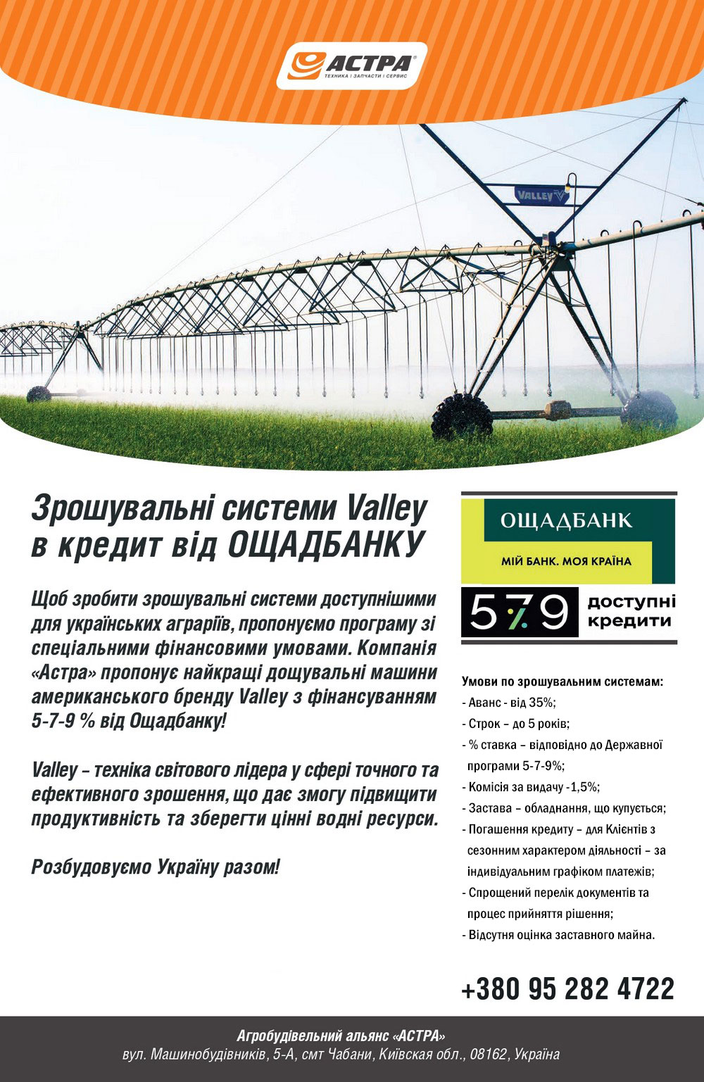 Шановні партнери! Щоб зробити зрошувальні системи доступнішими для українських аграріїв, пропонуємо програму зі спеціальними фінансовими умовами. Компанія «АБА «Астра» пропонує найкращі дощувальні машини американського бренду Valley з фінансуванням 5-7-9 % від Ощадбанку!