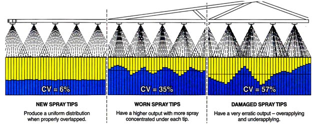Забезпечують рівномірний розподіл при правильному накладенні | Забезпечують вищу продуктивність у зв'язку з великою кількістю розпилюваної речовину під кожним наконечником | Забезпечують дуже нерівномірне розпилення – високий ступінь накладення і неповне охоплення ділянки |