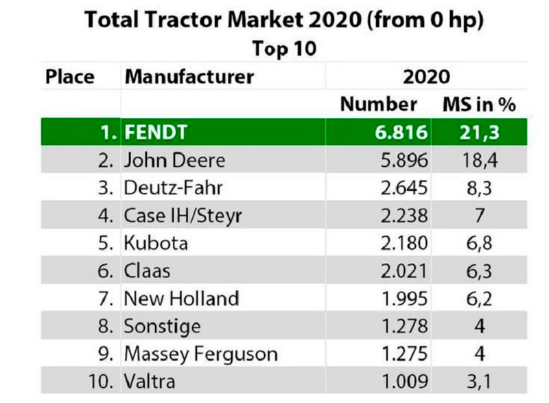 Также, в течение последних 10 лет компания Fendt постоянно увеличивала свою долю рынка. В 2020 г. доля рынка тракторов Fendt мощностью 51 л.с. увеличилась на 1,3%. 10 лет назад доля рынка Fendt во Франции составила 8,03%. В категории специальных тракторов Fendt 200 V/F/P Vario является лидером рынка во Франции с долей 19,4%.