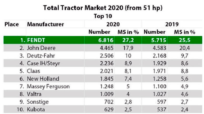 Кроме того, Fendt достиг нового рекорда в классе 51 л.с. и выше. Здесь марка достигла доли рынка в 27,2%, что на 1,7% выше прошлогоднего показателя в 25,5%. Отрыв от второго места увеличился на 9,3%.